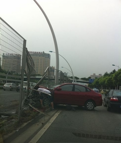目擊者陳先生稱,事發(fā)時,這輛紅色北京現(xiàn)代轎車正沿中環(huán)外圈行駛,在吳中路出口預備駛離中環(huán)?!爸宦牎Z’的一聲,整個車頭都撞在了護欄網(wǎng)上。”